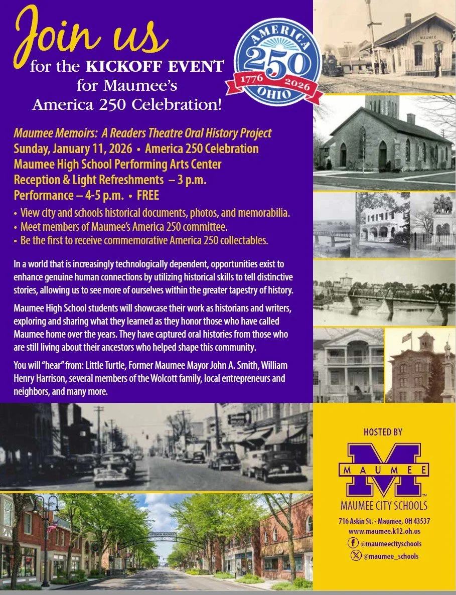 Join us as we officially kick off a full year of fun, historical, and community-centered events celebrating Maumee’s 250th anniversary. Our inaugural program, Maumee Memoirs: A Readers Theatre Oral History Project, invites the entire community to come together as we honor the stories that shaped our city.